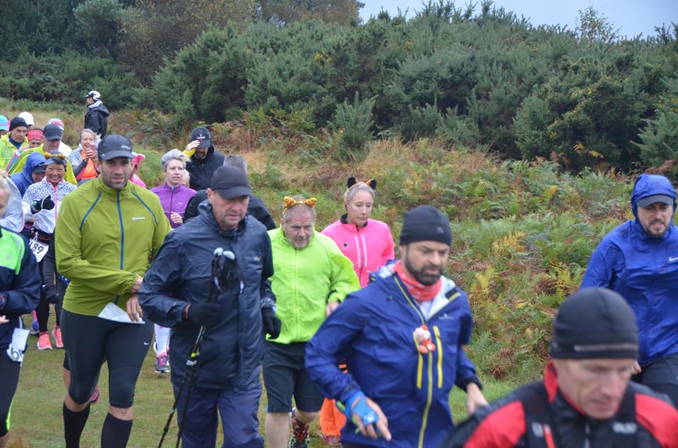 The course was a figure of 8 with a small and a big loop meeting back at the aid station. The first loop of just over 2 miles, and reminded me a lot of the unbelievable course that was "the wedding day challenge", just down the road (also in Ashdown forest). It was hilly, very hilly. For the first mile you plunged down hill on open rough trail until you hit a small forested section, which when exited, you kept going down along a long grassy section until you hit the low point of the course. Then you zig zagged your way all the back up again with long flat bits interspersed with 3 un-runnable sections. This is as hilly as you will ever come across and by the time we had made your way back to aid station the field had spread out. The second 3 mile odd loop was a lot flatter but still had some long drag uphills. The trail was generally good condition and the views when you reached the heights were spectacular over Sussex.