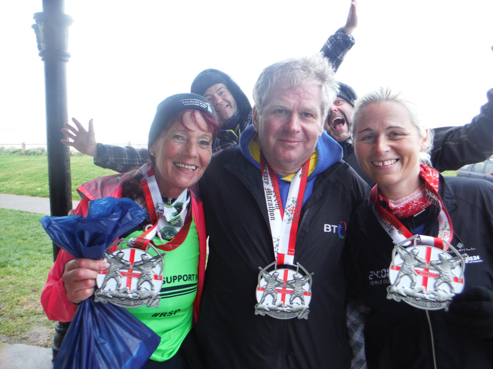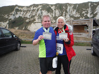 Day 3 was the 600th anniversary of the battle of Agincourt and there was the promise of a massive bespoke medal for this one. Arriving very much on time with Brenda and Collette it was very very very breezy on the sea front. The course was a T shape with first a short section downhill  from the aid station to the sea wall. We followed the prom into Margate right through the center of town turning at the far end. We then retraced our steps, bypassed the aid station and kept going for another 3K to the turn around point. This section weaved its way along the coast with the sea on one side and some interesting cliffs on the other. We turned and made our way back to the aid station.