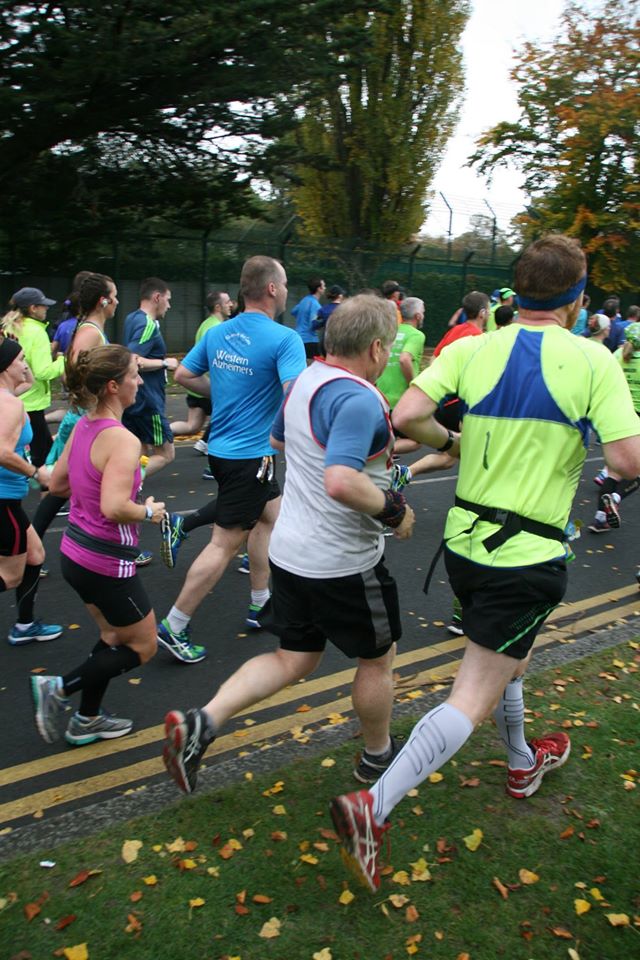 we went. The first few miles were with the wind and fairly flat until we hit the park. I was still there and despite sore quads felt OK. I was still settled at the back so I kept going. I fell back a bit at the narrow section when you leave the park for the first time. This was more to do with weight of runners than anything else. When back in the park I managed to get back into the pack and settled behind Olwyn and in front of Niall. The atmosphere in the pace group was fantastic with lots of advise being dealt out particularly by Joe.