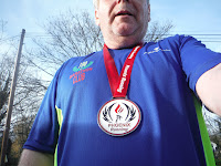 I tried not to think of my toe and kept a good pace,  trying hard on the flat and downhill sections and hiking hard up the steep bits. To my amazement as I approached the start/finish area the half marathon hadn't started and I managed to get through the start finish area in 2:01. It was a great atmosphere coming through the start/finish area. Soon after the half marathon with >350 runners started and for maybe 5 miles there was a steady stream of people streaming past me. Included was Kieran McVeigh the brother-in-law who eventually finished in 1:49 (pretty good). I was visibly tiring in the second loop and had a too and fro with Trevor Denton and Clive Nesbit. I eventually managed to break away from them at Mile 23. It was a cold and wet and muddy run and I was delighted to come home in 4:20;28 a 28 minute improvement on 2014. My Toe survived but it still needs attention but I think the worst is over.